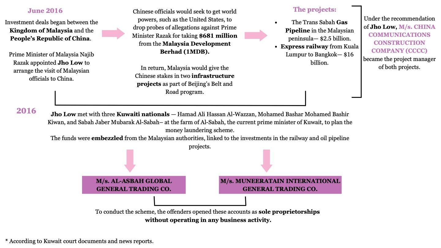 Using multiple bank accounts across various countries, including Kuwait, Malaysia, China, and the UK, and aided by leaders like Kuwait's prime minister, Jho Low funneled money from these infrastructure ventures β a $2.5 billion gas pipeline and a $16 billion railway β to offset the 1MDB debt.