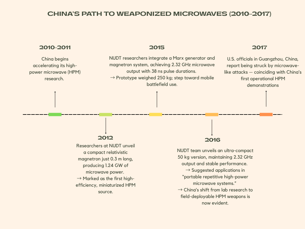 The Timeline Problem: China’s transition from laboratory research to operational HPM systems took place between 2010 and 2016—the same period when Havana Syndrome first emerged. The timing is striking, but correlation isn’t causation. The missing piece is motive: why would China risk exposure by targeting U.S. diplomats and intelligence officers?