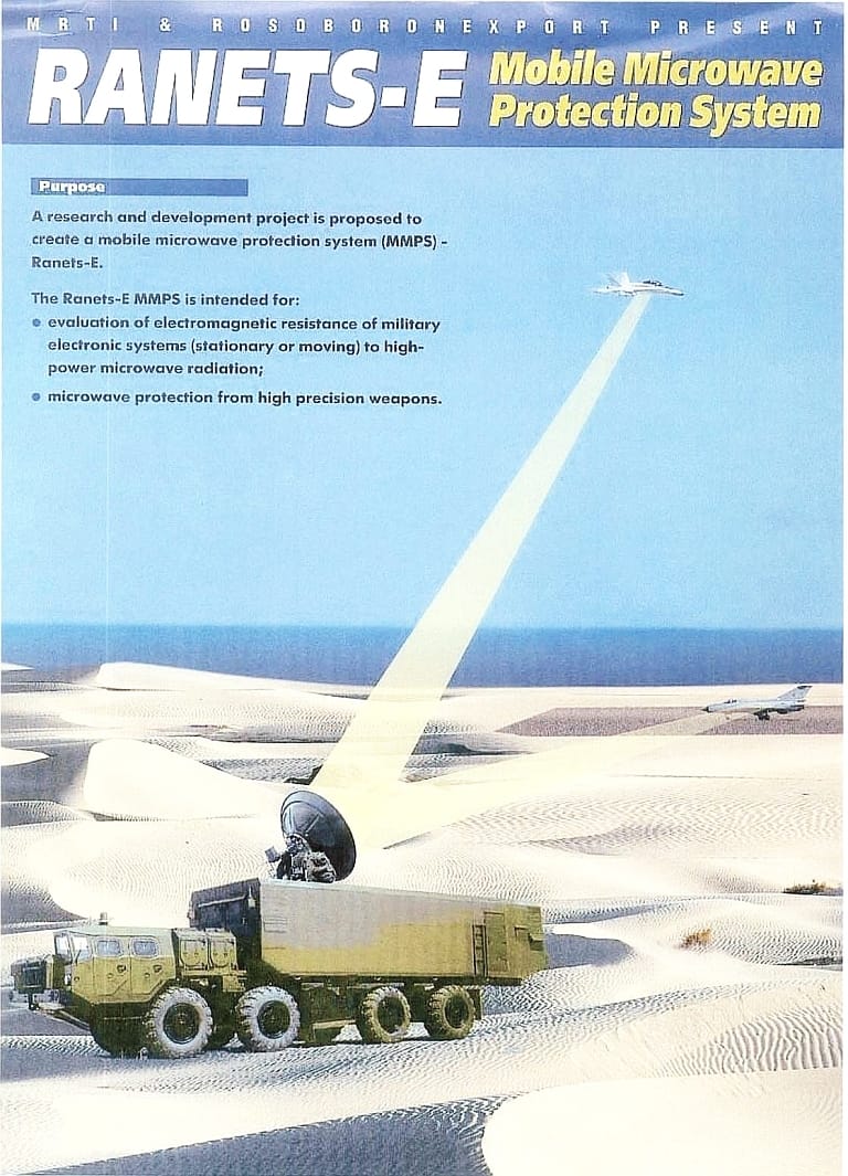 After the Soviet Union collapsed, Russia's microwave weapons program experienced both setbacks and continuities. The 1990s saw the emergence of the Ranets-E mobile high-power microwave defense system, developed by the Moscow Radiotechnical Institute. Publicly unveiled at the 2001 LIMA arms exhibition in Malaysia, Ranets-E was mounted on a MAZ-543 heavy truck and featured a large parabolic antenna.