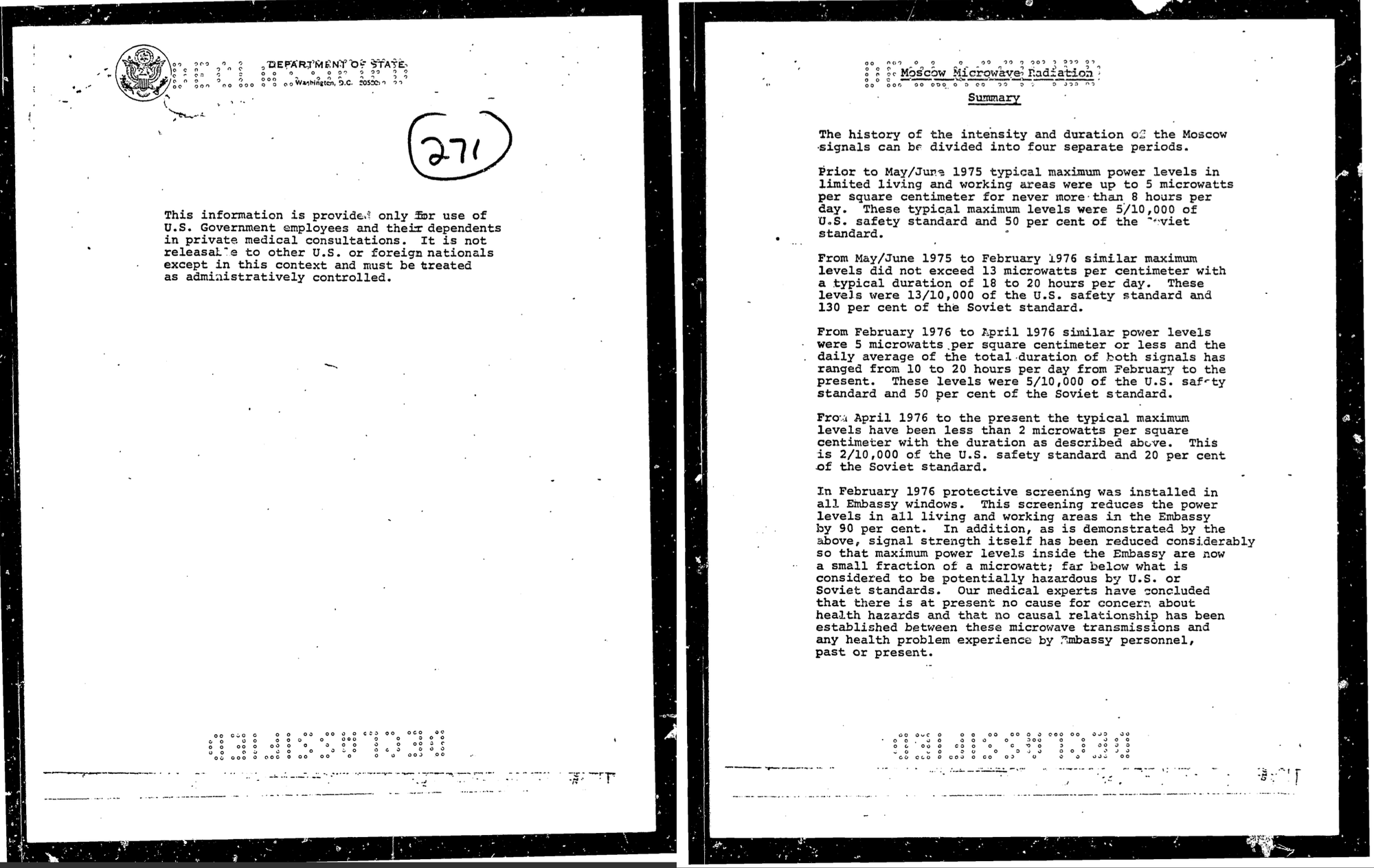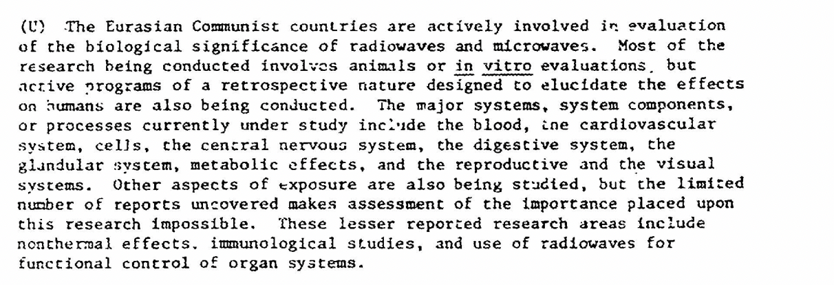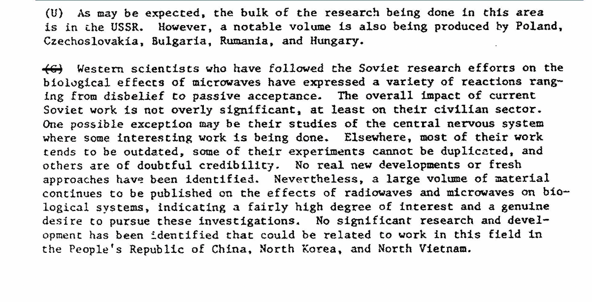 The United States had long been aware of Russia’s deep involvement in this line of research. A classified 1976 Defense Intelligence Agency report titled Biological Effects of Electromagnetic Radiation - Eurasian Communist Countries warned that "Eurasian Communist countries are actively involved in evaluation of the biological significance of radiowaves and microwaves." The report specifically notes research into effects on the "central nervous system" and "internal sound perception"—precisely the symptoms that would emerge in Havana four decades later.
