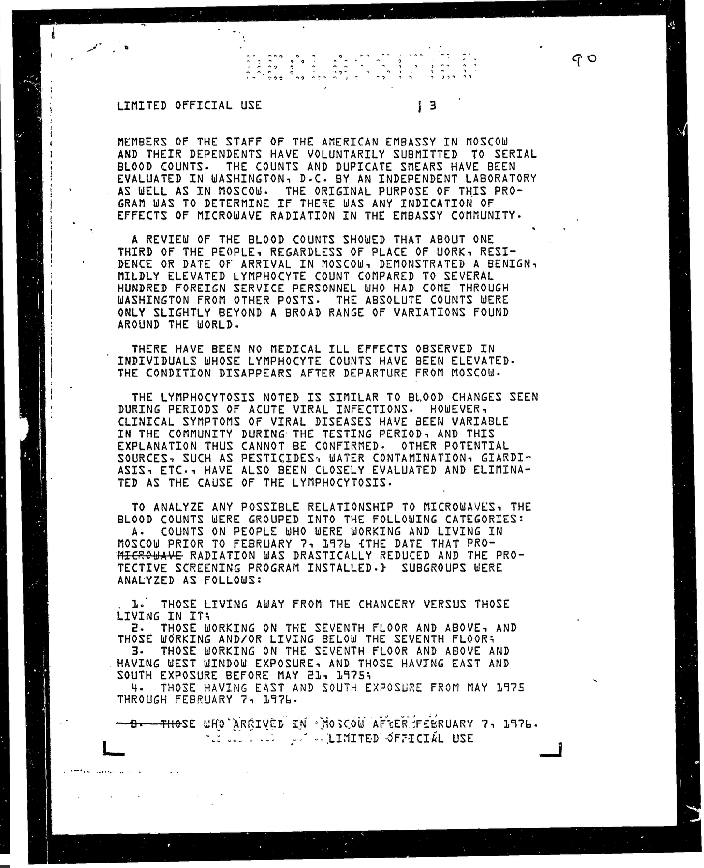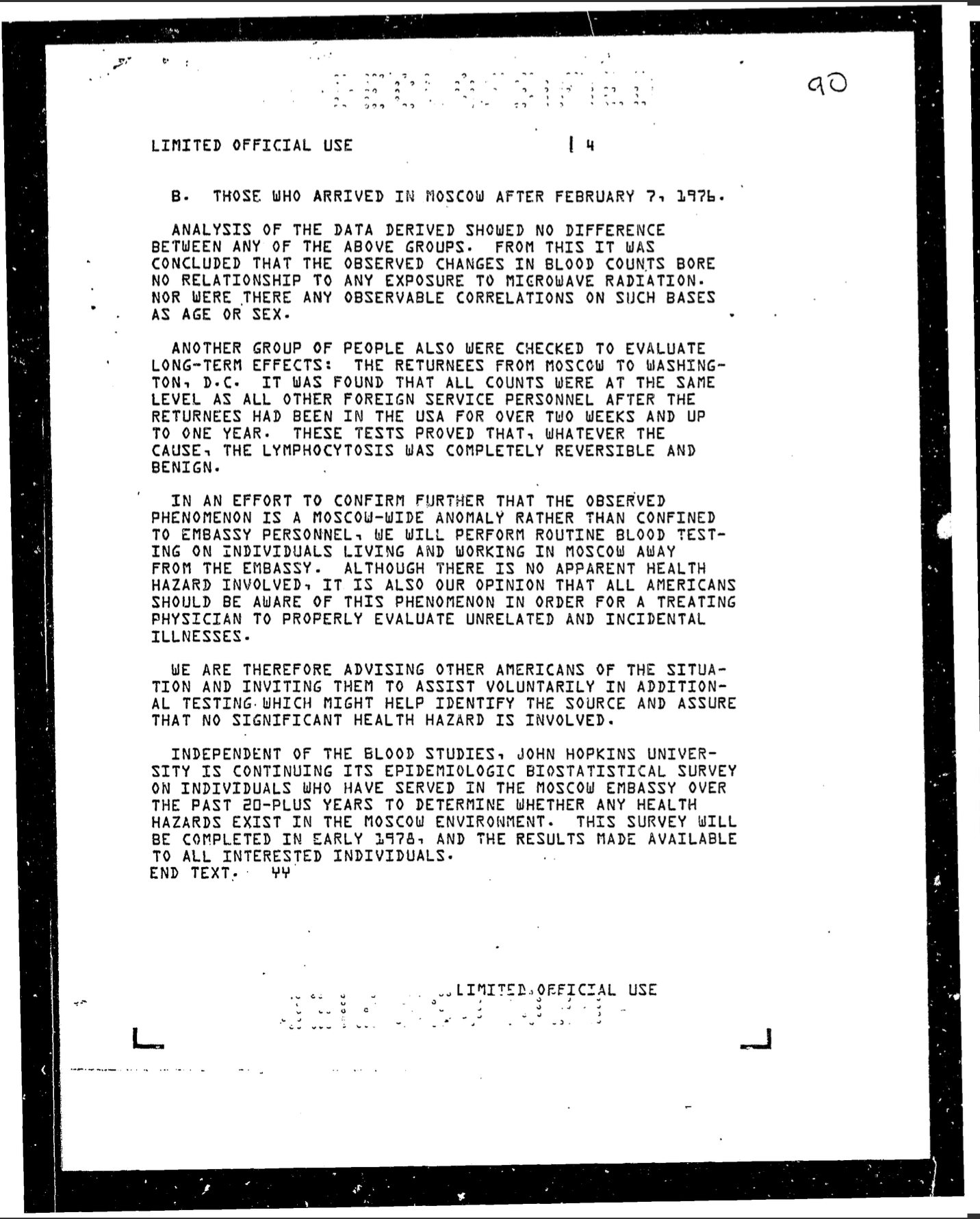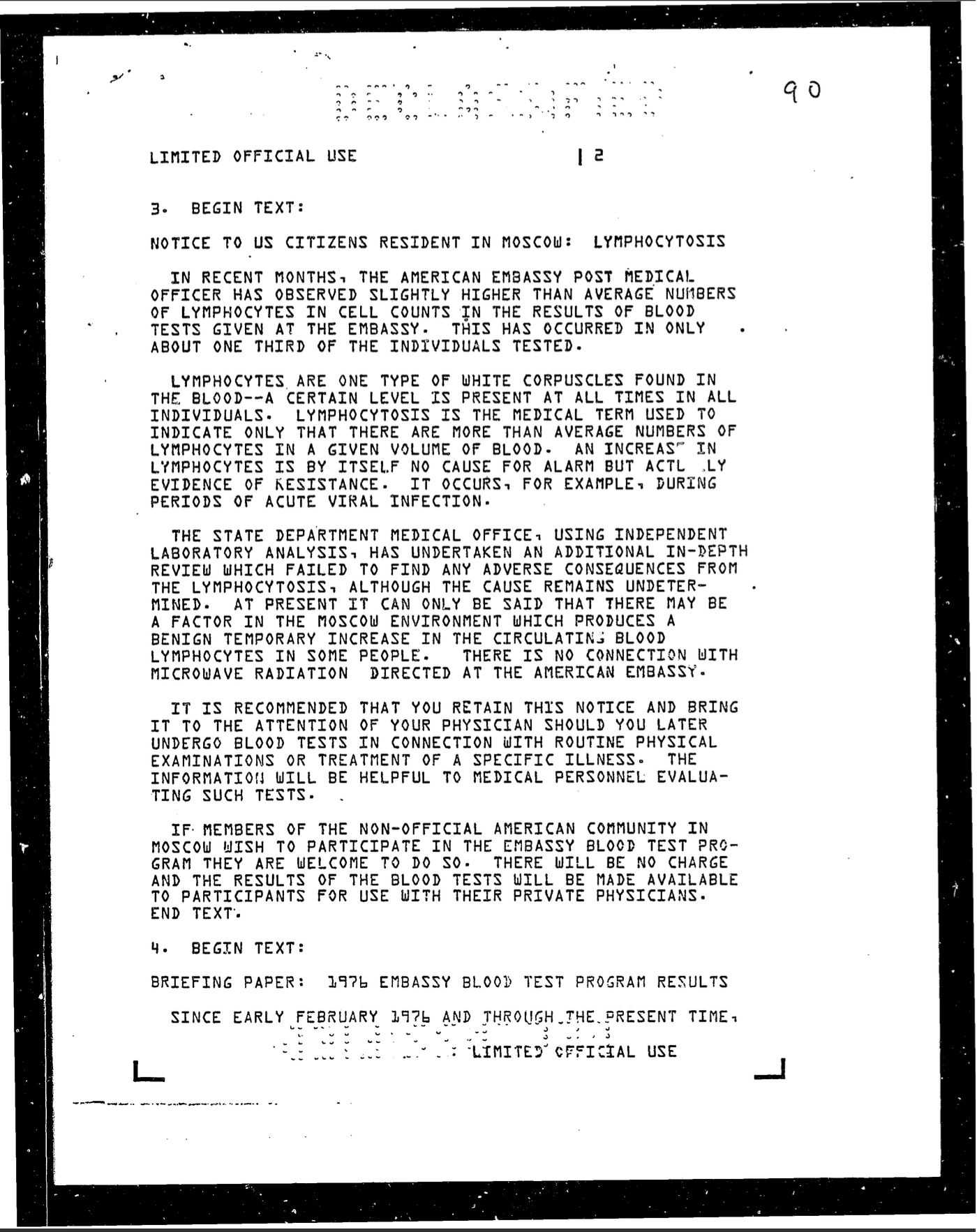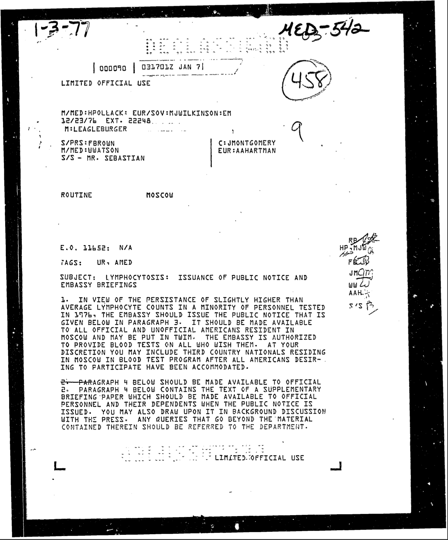 Notice confirming that one-third of American officials at the U.S. Embassy in Moscow had elevated lymphocyte count.