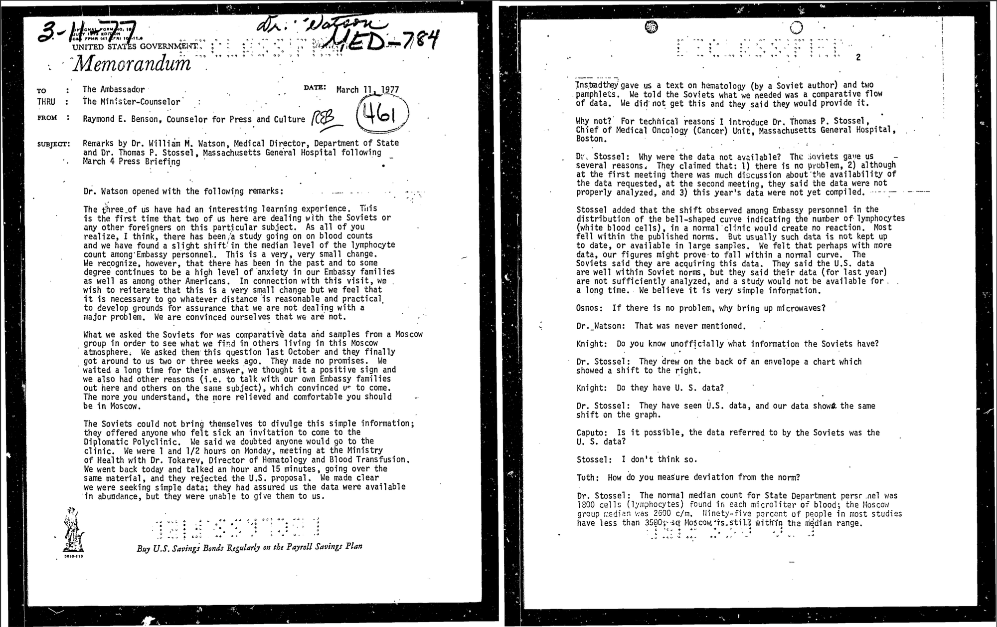 By the late 1960s and 1970s, U.S. officials grew increasingly alarmed at potential health effects. American ambassadors—Foy Kohler, Llewellyn Thompson, Jacob Beam, and Walter Stoessel—repeatedly protested to the Soviet Foreign Ministry. Ambassador Stoessel's case was particularly troubling: he suffered nausea, eye bleeding, and ultimately developed leukemia.
