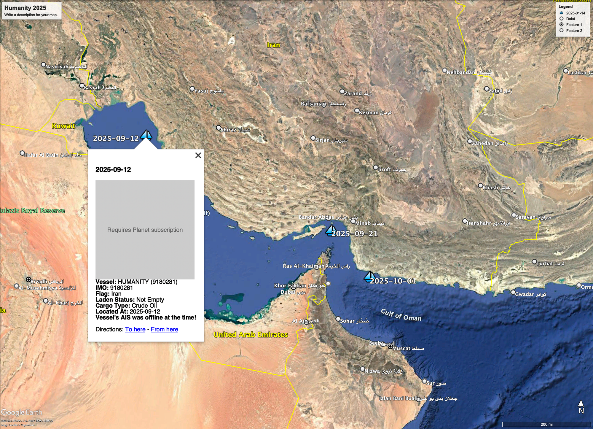 Below, we show exclusive satellite imagery of the HUMANITY, an Iranian tanker under U.S. sanctions since May 2025 and added to the United Nations blacklist in September. TankerTrackers.com has been monitoring the vessel’s movements throughout the year.